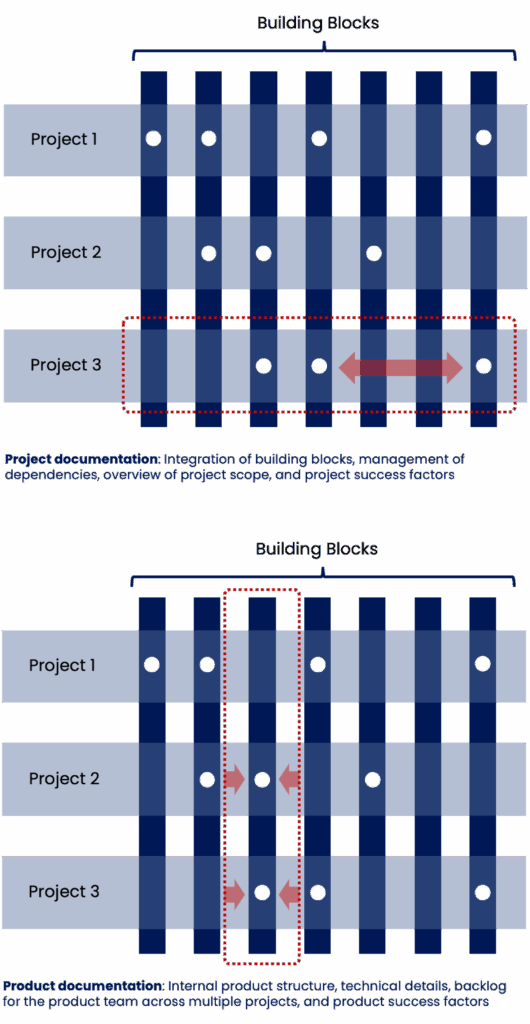 In contrast, the documentation of individual building blocks is significantly more detailed. For building block-specific documentation, the responsible teams must consider multiple projects and processes. It contains a lot of information that is not relevant to every project. For obvious reasons, project documentation should not be a duplicate of the documentation of multiple building blocks. Documentation of overarching topics such as company-wide data protection or compliance behaves similarly.