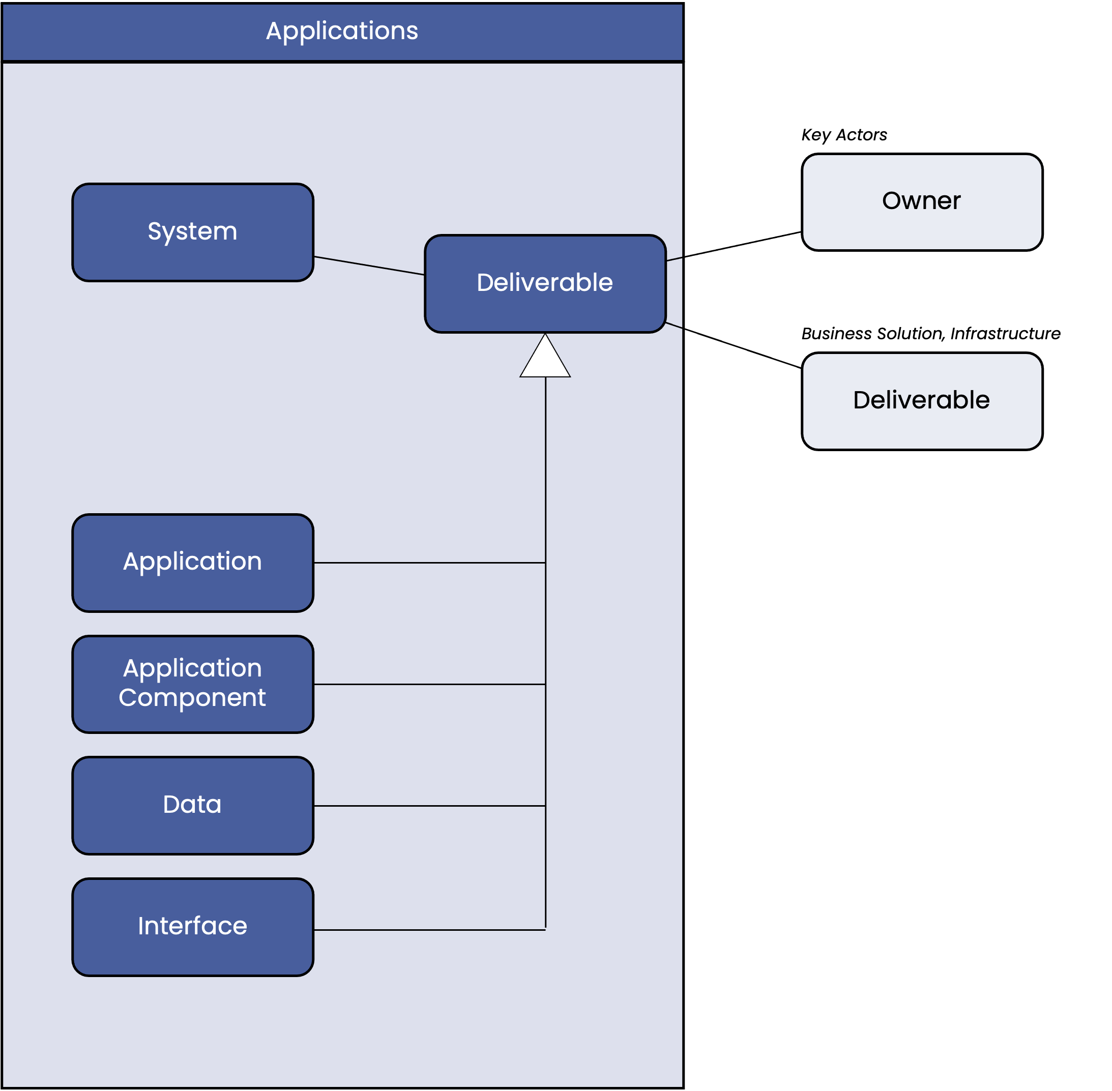 The “Application” section contains software systems and their sub components such as applications, application components, data objects, and interfaces.