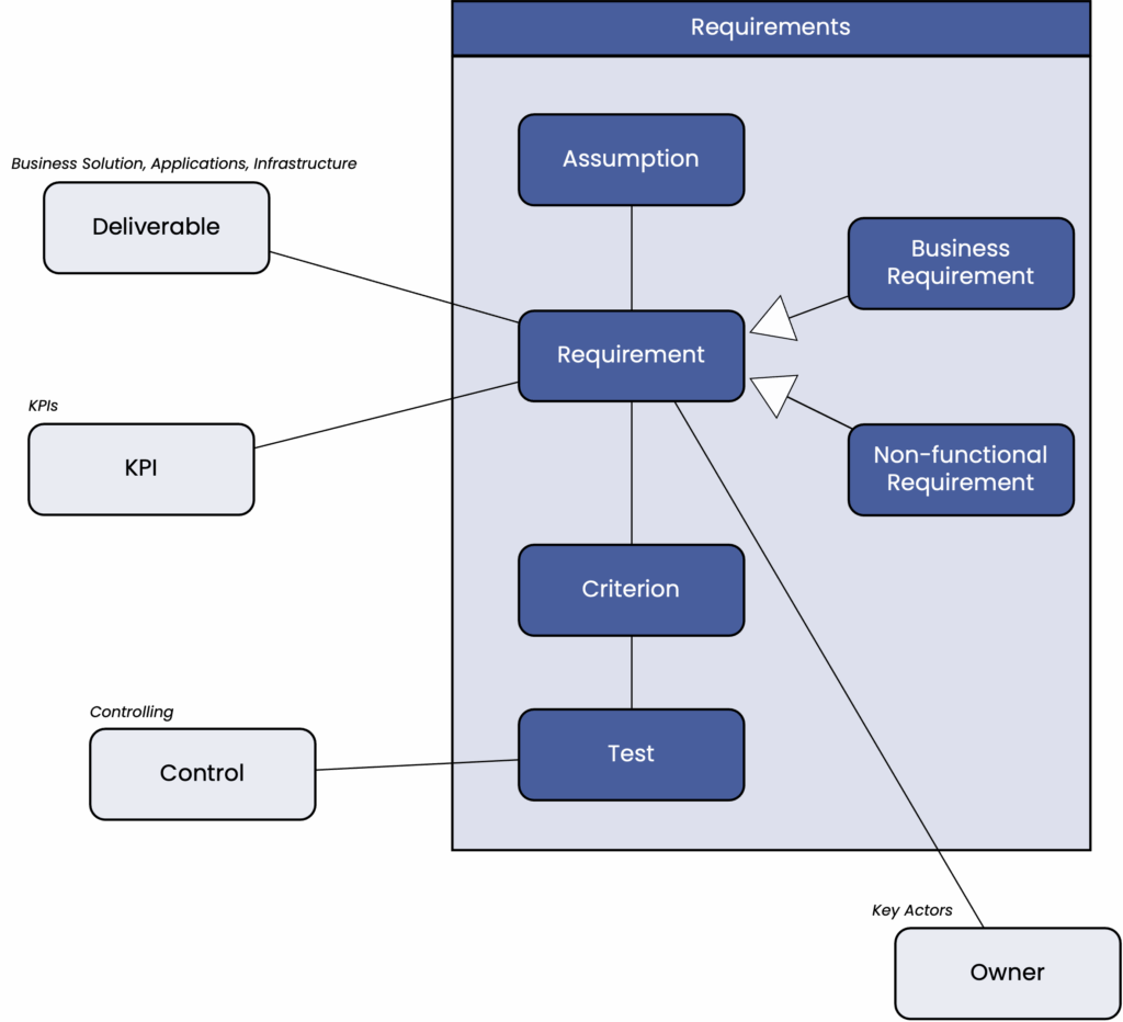 The “Requirements” section describes the most important constraints and requirements for a project as a whole. In particular, it formulates those central requirements whose non-fulfillment would lead to dealbreakers—i.e., the failure of the project. Detailed requirements, e.g., for individual project steps, are processed and recorded separately in the individual teams.